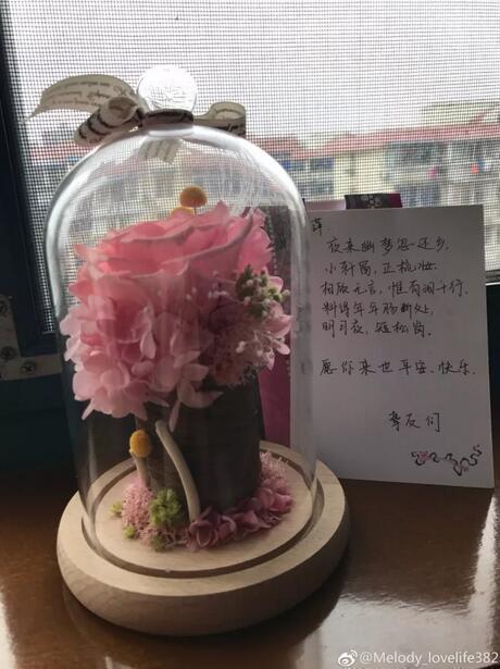 热心网友送来的抱枕 今年7月,当地计生委给杨敢连办理了计划生育家庭特别扶助证,给这位失独老人发放了扶助金。女儿去世这一年多以来,杨妈妈只梦见过一次女儿,“大概是当了老师以后,她坐在那里,我问她,冷不冷,她说,‘妈妈,我不冷’。” 窗台上,一瓶永生花面朝窗外,阳光透过玻璃罩,粉色花瓣定格在绽放瞬间。不远处的桌上,老人伛偻着腰摆上蛋糕,一旁的贺卡写道:“望你在天之灵一定领受,来世我们再见。”(来源新民晚报)
