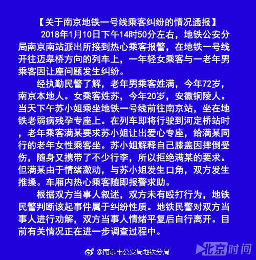 12日,@南京市公安局地铁分局 对情况作出通报,称该起纠纷地铁警方接到报警后处理,并未发生网友猜测的有双方殴打和殴打警察的情况。 在此也提醒,遇到事情大家请冷静,保持礼让三分,避免引起不必要的麻烦! |