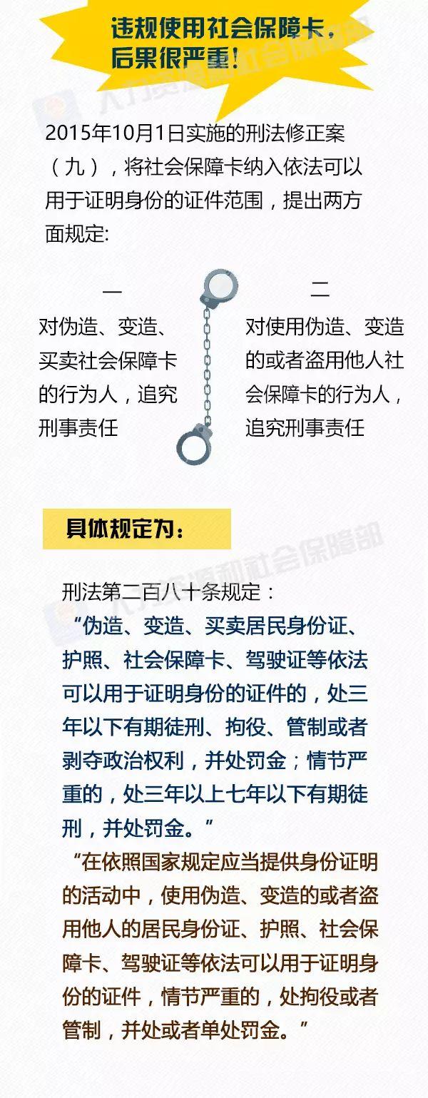 社保卡既是我们的一种身份凭证,又能进行就医结算、自助查询、还能进行待遇领取、现金存取等操作。但是,大家一定要注意,以下这些行为,违反基本医保险法规定,可能会被暂停使用社保卡,甚至追究刑事责任的! 1、购买生活用品、与疾病治疗无直接关系的体育健身或养生保健等消费等; 2、医药换药(物)、转卖药品、套用和虚开检查治疗项目等骗取医疗保险基金,超范围购药囤积药品等; 3、冒用别人的医保卡; 4、把自己的卡借给别人; 5、伪造或者使用虚假病历、处方、检查化验报告单、疾病诊断证明等医疗文书和医疗费发票,作为医保账户报销凭证,会被视为医保欺诈; 6、在医院使用社保卡开超出病情所需药量的药物,再转手倒卖给别人,这属于套取社保基金的行为,是非法牟利和不当得利。 5 社保卡又有新功能,还有102项福利等你畅享! 在不久的将来,所有持卡人仅凭一张社保卡,办理就业、社保、医疗、人事、劳动关系等九大类共102项业务。