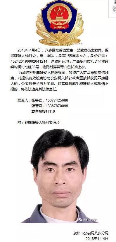 | 4月4日上午,贺州市八步区桂岭镇均洞村发生一起故意伤害案,造成三人(一男两女)死亡,一人重伤。4月6日,警方将嫌疑人抓捕归案。 惨案发生 疑凶锄头抡死3人 4日上午8时多,受害人陈某及其丈夫钟某雄、邻居黄某在屋后的地块劳作。 突然,嫌疑人钟某持锄头冲到地块上,朝正在种地的陈某头部挥去,陈某当场倒地。钟某追上另外两人,将其撂倒,袭击对方头部等要害部位。 受害人的儿媳妇在家中带小孩,听见屋后叫声,出门察看时,被钟某遇见,也被他用锄头袭击倒地。所幸有村民目睹此景,立即把小孩抱走,小孩逃过一劫。 经确认,陈某夫妇、黄某当场身亡,陈某儿媳妇受重伤,被送往医院抢救,目前已经脱离生命危险。 惨案原因 竟是修路引发纠纷 从当地村民处了解到,嫌疑人钟某想在受害人陈某屋后修一条路通往自己家中,但受害人不同意,双方因此产生纠纷,两人还为这事打过官司。 案发后,嫌疑人钟某逃离现场。记者从八步警方获悉,经查,钟某今年49岁,警方悬赏两万元,组织刑侦等部门警力侦破此案。