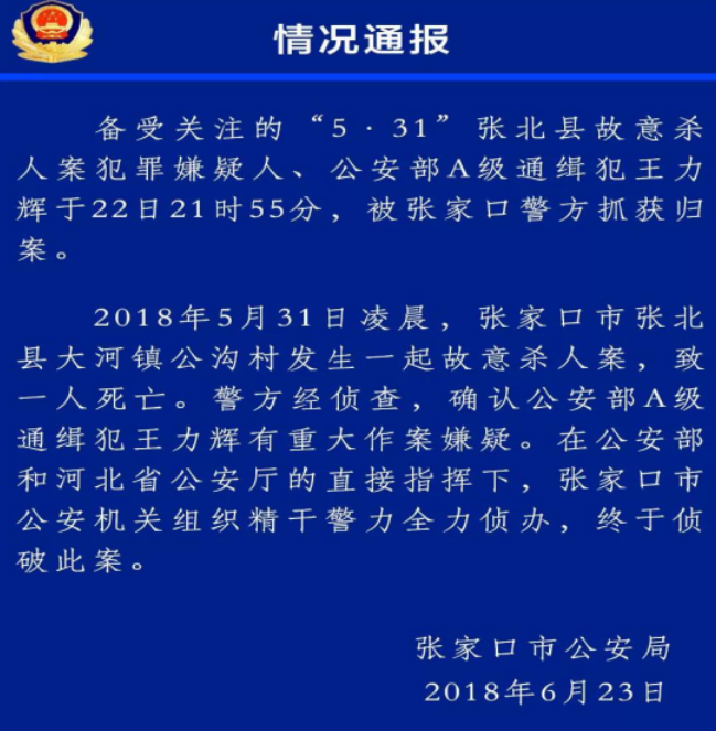 | (6月23日)早晨,北京时间记者从河北省张家口市张北县公安局获悉,“5.31”故意杀人案犯罪嫌疑人、公安部A级通缉犯王力辉于6月22日21时55分,被该市警方在该县境内抓获。
