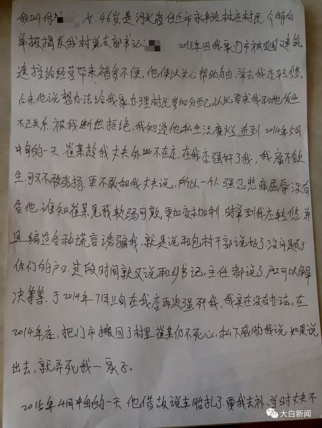 图为付女士的举报信 曾向纪委举报,办事处书记以影响声誉为由不予调查 6月22日下午,大白新闻按照举报信上的电话联系方式,联系到了付女士。付女士称,自己确实被村支书强奸。在2016年12月第一次向河北省任丘市纪委举报崔某某。一个礼拜后,任丘市纪委告知她去任丘市永丰路办事处解决该问题。任丘市永丰路办事处党委书记郝书记,和她沟通过几次,以对孩子声誉影响不好为由,并没有对崔某某进行调查,而崔某某仍是村里的村支书。 有意败坏他人,不顾自己名节 对此,河北省任丘市永丰路办事处党委书记郝书记告诉大白新闻,自己是去年接触此事的。经了解情况后,出于对付女士和其家庭的名誉考虑,无论采用什么手段调查都会对孩子产生影响。也担心因此毁掉孩子的声誉,付女士本人也认可这种说法。并且除了付女士没有人反映过此事。向其他村与崔某某有对立情绪的村干部了解情况,并没有此类言论。付女士目的不纯,可能是因为村里集体财产分配问题想获取更多利益。最近此事又出现在网络上,可能是也是因为今年换届崔某某又当选该村党支部书记有关。 郝书记说:“崔某某那时候50多岁了,这个女同志你没见过,不能说丑陋不堪,但是远没有这个姿色,不会引起任何欲望。河北正在建设政治护城河,从政廉洁是我们的要求,我们不会袒护一个支部书记。我以党委书记的职务,以一个党员的党性证明,真实情况不是付女士所说的,这是有意败坏他人并不顾自己的名节。”