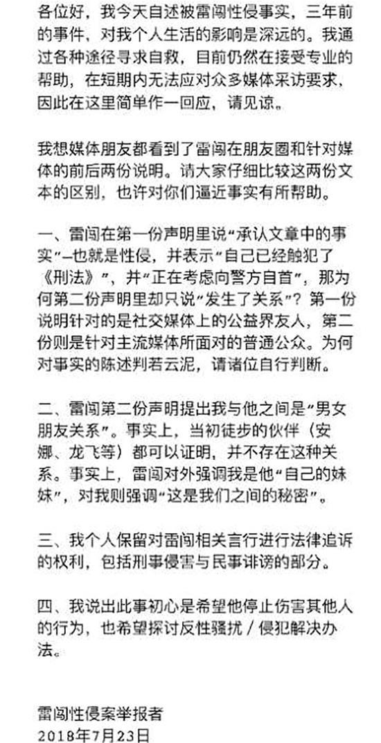 | 近日,女孩丽丽(化名)实名举报知名公益人、亿友公益发起人雷闯性侵一事引发关注。丽丽的举报文章发布后,雷闯本人先后两次回应,一次是在自己的朋友圈,一次是对媒体。他称将辞去亿友公益负责人职务,并考虑向警方自首,承担相关的刑事责任,并称曾与举报人发展成恋人关系。 7月23日晚,举报人丽丽对外发布声明,称三年前的事件,对她个人生活的影响是深远的,她通过各种途径寻求自救,目前仍然在接受专业的帮助,在短期内无法应对众多媒体采访要求,因此在这里简单作一回应。 针对雷闯对媒体称举报人与他之间发展成“男女朋友关系”,丽丽回应道,当初一起参加徒步活动的伙伴可以证明不存在这种关系,雷闯对外强调她是“自己的妹妹”,对她则强调“这是我们之间的秘密”。 雷闯此前接受澎湃新闻采访时称,丽丽所指的性侵发生后,二人发展成了恋人关系,也曾一起旅游,“或许站在当事人的角度,并没有认可我男朋友的身份,而是基于我们已经发生的关系,她不得不默认我这个‘男朋友’,而事实上可能在她心理也是非自愿的。” 丽丽在声明中还称,她个人保留对雷闯相关言行进行法律追诉的权利,包括刑事侵害与民事诽谤的部分,她说出此事初衷是希望他停止伤害其他人的行为,也希望探讨反性骚扰/侵害的解决办法。