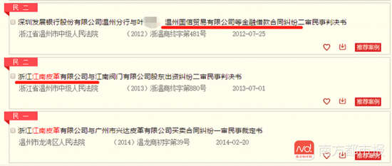 公开信息显示,黄鹤出生于1974年。28岁那年,他出资158万认购了浙江江南皮革有限公司约10%的股份,成为公司的原始股东之一。8年后,他与别人合资成立了一家新公司,持股比例为62%,是新公司的实控人。 这两家公司名字均包含"江南皮革厂",却相互独立,且注册地、注册时间、主营业务均不相同。 2010年7月20日,温州江南皮革厂和中国光大银行签订授信协议,共贷款3000万元。温州市宏得利树脂有限公司(简称"宏得利公司")、临海江南皮革厂、黄鹤三方作为连带共同保证人,为其提供贷款担保。 然而,温州江南皮革厂未能如约还款。2011年6月,宏得利公司向银行代偿了3000万借款及23万的利息。几年后,两家江南皮革厂作为一、二被告同时被宏得利公司起诉,被要求承担相应赔款责任。 温州国信贸易有限公司是黄鹤妻子邵某的公司。这家公司成立于2009年,主营货物与技术进出口业务等。邵某持有公司52%的股份,是公司的实际控制人。2011年4月,黄鹤和妻子邵某一起失联,该公司也随之停业。 失联前,黄鹤多次以公司或个人的名义与银行签订授信协议,除了上文提及的光大银行外,黄鹤还与深圳发展银行、温州市龙湾农村合作银行等机构存在借款纠纷,不仅贷款金额巨大,贷款手法也如出一辙。