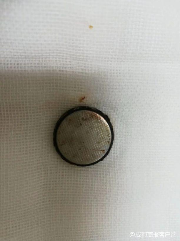 ▲痛苦的浩浩躺在床上让人心疼 当天下午,浩浩妈带着儿子火速赶往成都市妇女儿童中心医院,门诊医生刘璐为浩浩坐诊。“浩浩妈拿着一张胸片进来,我看了就担心是纽扣电池,让她反复回忆。”但浩浩妈回忆不清楚,考虑到风险极大,刘璐立刻拨通了主任徐幼的电话。 拖不得的手术 纽扣电池已严重腐蚀 “异物较大,手术风险也极大,如果是纽扣电池卡了近20天了,手术就更拖不得。”手术就定在当晚,做出这个决定的时候,徐幼主任医生已经下班,但她必须为浩浩加班急诊手术。 得知儿子吞下的可能是纽扣电池,浩浩妈怎么也安心不了。2016年,广元一3岁女娃误吞纽扣电池3个月,电解质漏液导致其全食道僵硬、出现食道疤痕性狭窄,几乎丧失功能。 徐幼立刻指挥科室医务人员,联系麻醉等科室,组成手术团队,开通绿色通道。同时,浩浩继续完成各项检查,进行术前准备。 8月14日深夜,经过近一个小时的紧张手术,徐幼手术团队通过食管内镜手术,从2岁的浩浩食管中取出一枚已经严重腐蚀的纽扣电池,此时,食管周围长出的肉芽已经将其包裹,并出现严重肿胀、糜烂的表现,浩浩需接受后续观察治疗,为浩浩可能面临的食道穿孔、出血和重金属中毒等问题做好预防和准备。