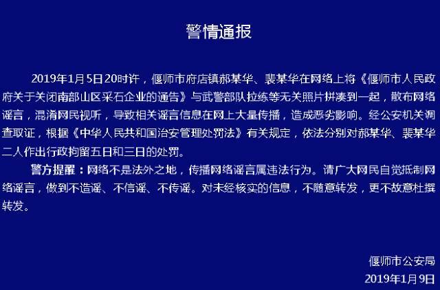 通报显示,2019年1月5日20时许,偃师市府店镇郝某华、裴某华在网络上将《偃师市人民政府关于关闭南部山区采石企业的通告》与武警部队拉练等无关照片拼凑到一起,散布网络谣言,混淆网民视听,导致相关谣言信息在网上大量传播,造成恶劣影响。经公安机关调查取证,根据《中华人民共和国治安管理处罚法》有关规定,依法分别对郝某华、裴某华二人作出行政拘留五日和三日的处罚。 警方提醒:网络不是法外之地,传播网络谣言属违法行为。请广大网民自觉抵制网络谣言,做到不造谣、不信谣、不传谣。对未经核实的信息,不随意转发,更不故意杜撰转发。 |