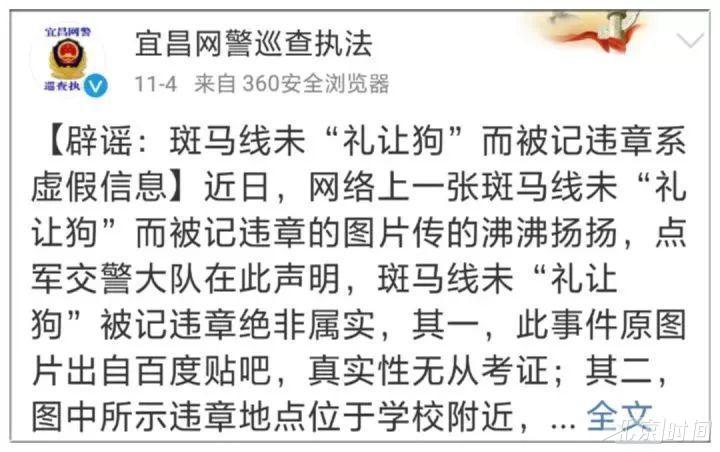 辟谣:@宜昌网警巡查执法 在微博中称,斑马线未“礼让狗”被记违章的消息并不属实。