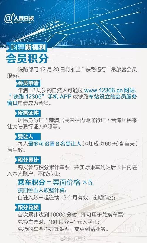 从12月20日起,铁路部门推出“铁路畅行”常旅客会员服务,会员可凭积分兑换火车车票。铁路常旅客会员在购买车票时,可以获得相应的积分。(具体按照车票票面的5倍累计计算,例如100元车票可获得500元积分)。当积分累计到10000分时,乘客就可以积分兑换铁路部门指定车次的火车票。(来源:法制晚报)