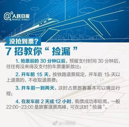 据了解,火车票起售45分钟后,如果部分抢票网民未及时支付,45分钟后这些票源将返回票仓。而根据过往的经验,开车前15天是退票高峰期,在首次放票外,有时铁路部门也会在开售车票后其他时段分批放票,一般在每天的整点、半点都会有车票放出;开车前48小时和24小时,售票系统往往会放出部分剩余车票。(来源:人民日报)