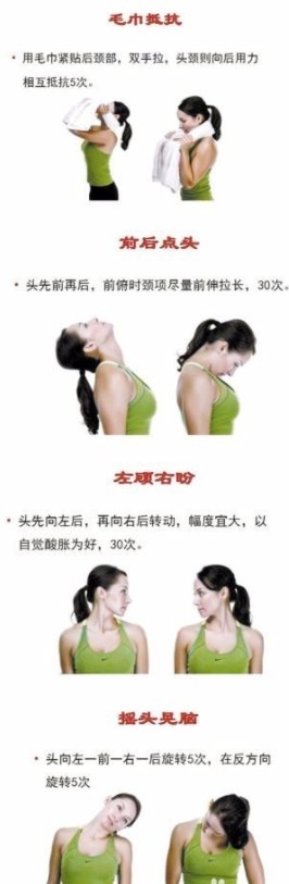 将双手交叉抱于头后,头用力向后仰,双手用力向上托住头,每小时进行一次,每个动作坚持30秒,一次6组。