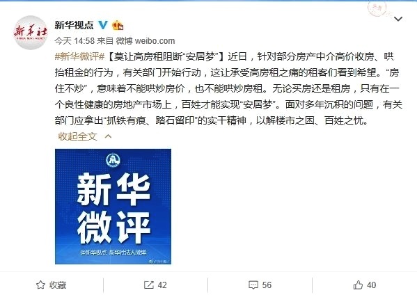 2018年8月21日,新华社官方微博新华视点发表微评——莫让高房租阻断“安居梦”。