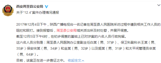通报中提到,2017年12月4日下午,陕西广播电视台一名记者在周至县人民医院采访过程中遭到相关工作人员的阻拦和殴打。接到报警后,周至县公安局城关派出所及时处警,并展开调查。