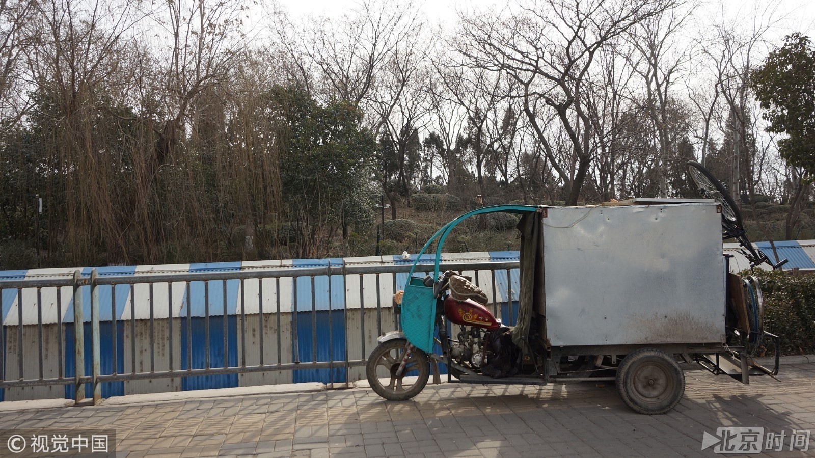 2018年1月25日,济南,在大明湖北门附近一辆改装的三轮车停靠在护城河旁。