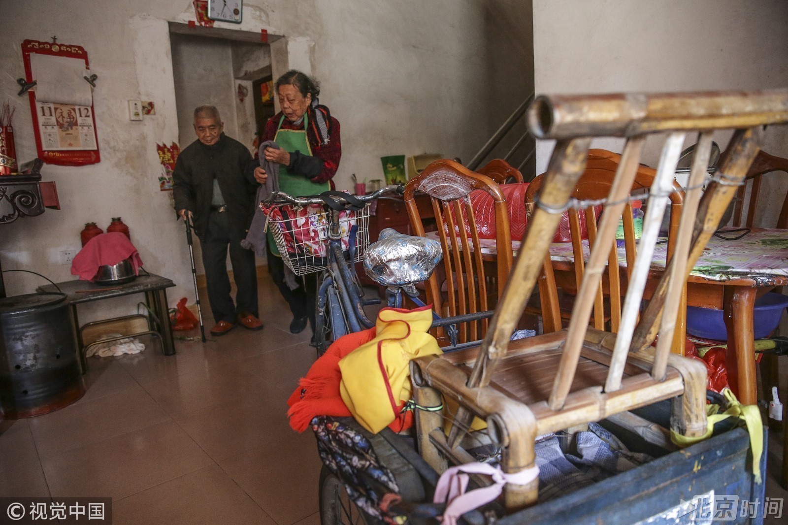 衣服穿好后,王丽霞递给老伴一根拐杖,嘱咐他慢慢踱步到客厅,她自己把三轮车连拖带拉地弄到路边。
