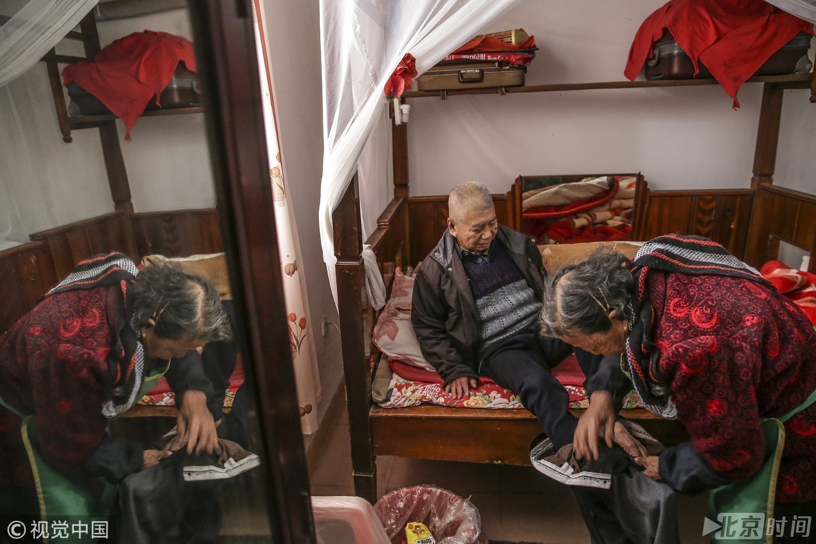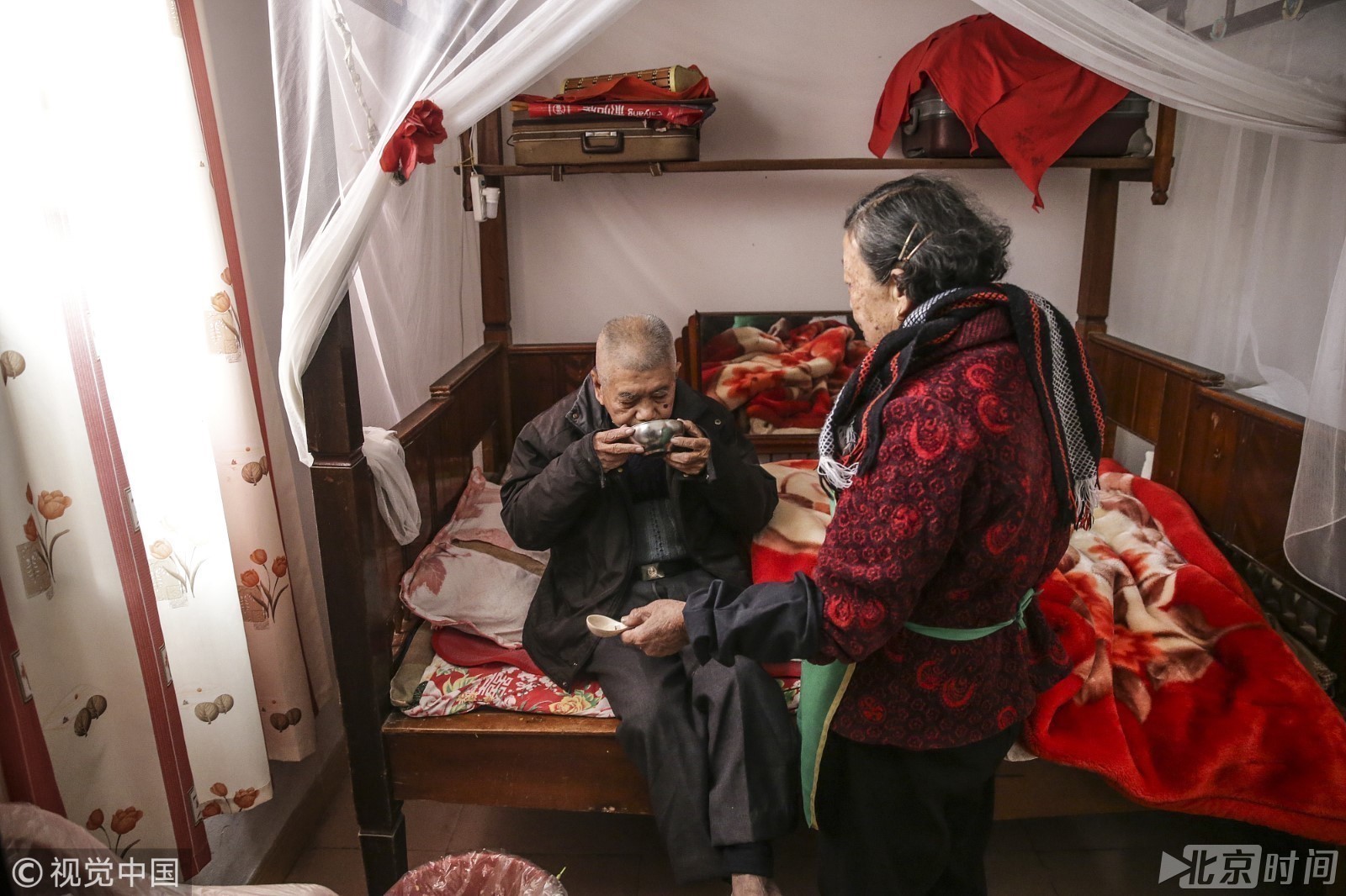 王丽霞盛了一碗鸡汤到卧室,鼓励老伴自己坐起来喝。喝完热汤,身体暖和了,王丽霞就拿来裤子,让他自己慢慢穿上。