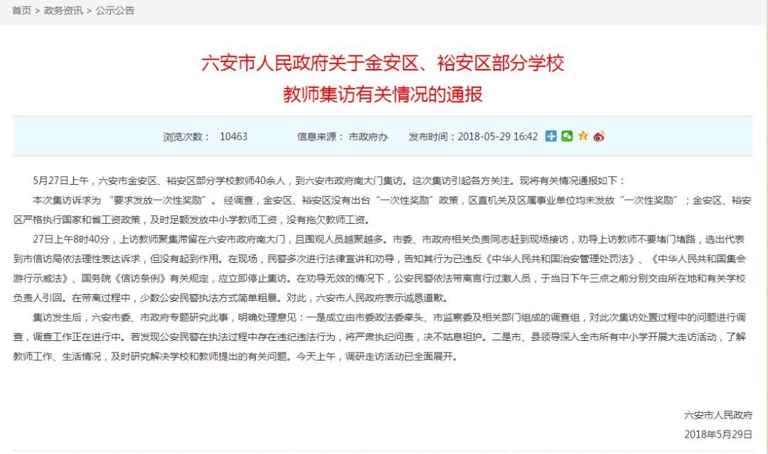 今日下午,“六安发布”公布了六安市人民政府关于金安区、裕安区部分学校教师集访有关情况的通报。