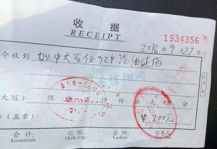 进店后,工作人员称加油站没有发票,只有收据。随后,加油站工作人员给笔者开据了一张收据......而且该收据盖的是一个“萝卜章”,盖了二次都看不清楚。