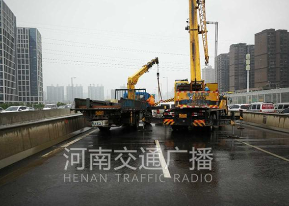 截止到7点40分,河南交通广播记者佑龙从现场了解到:吊车正在对撞散的限高架进行拖移,预计还需要半个小时。受此影响,中州大道 紫东路南向北主道断行。