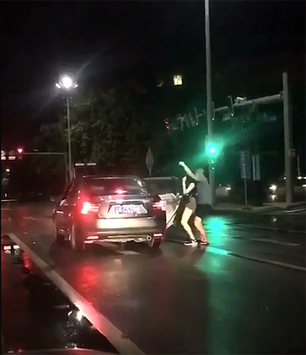 8月5日凌晨2时许,一辆悬挂西双版纳号牌的轿车停在城区客运南站十字路口等待交通信号灯时,乘坐在该车后座的一名黑衣女子,突然推门下车并站在机动车道上跳舞,随后乘坐在副驾驶座位上的一名男子也开门下车,与该女子在机动车道上一同热舞。