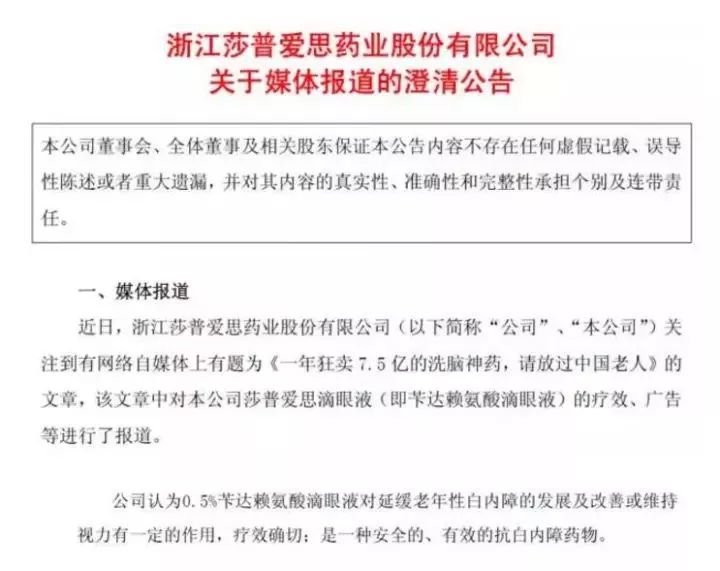 12月2日,一篇名为《一年卖出7.5亿的洗脑“神药”,请放过中国老人》的文章称,多位眼科医生并不认可莎普爱思滴眼液的“白内障防治功效”。质疑者认为,莎普爱思滴眼液是“假科普,真营销”,通过广告误导患者。