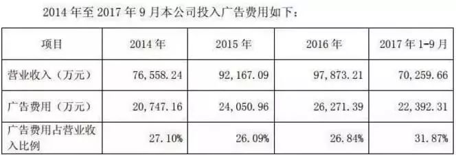 之前媒体发布的文章也对莎普爱思“用各种广告轮番洗脑”的行为予以了质疑。莎普爱思公告的数据显示,2014年度至2017年1-9月,公司的广告费用分别为2.1亿元、2.4亿元、2.6亿元、2.2亿元,分别占公司营收占比的27%、26%、26.84%和31.87%。同业上市公司的广告费用占比基本不会超过20%。